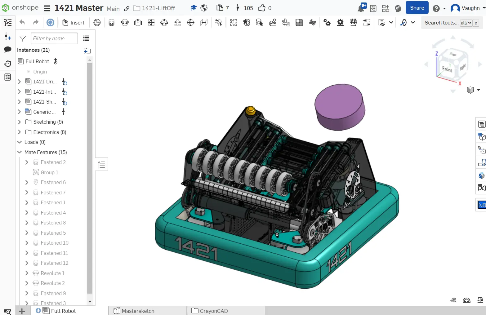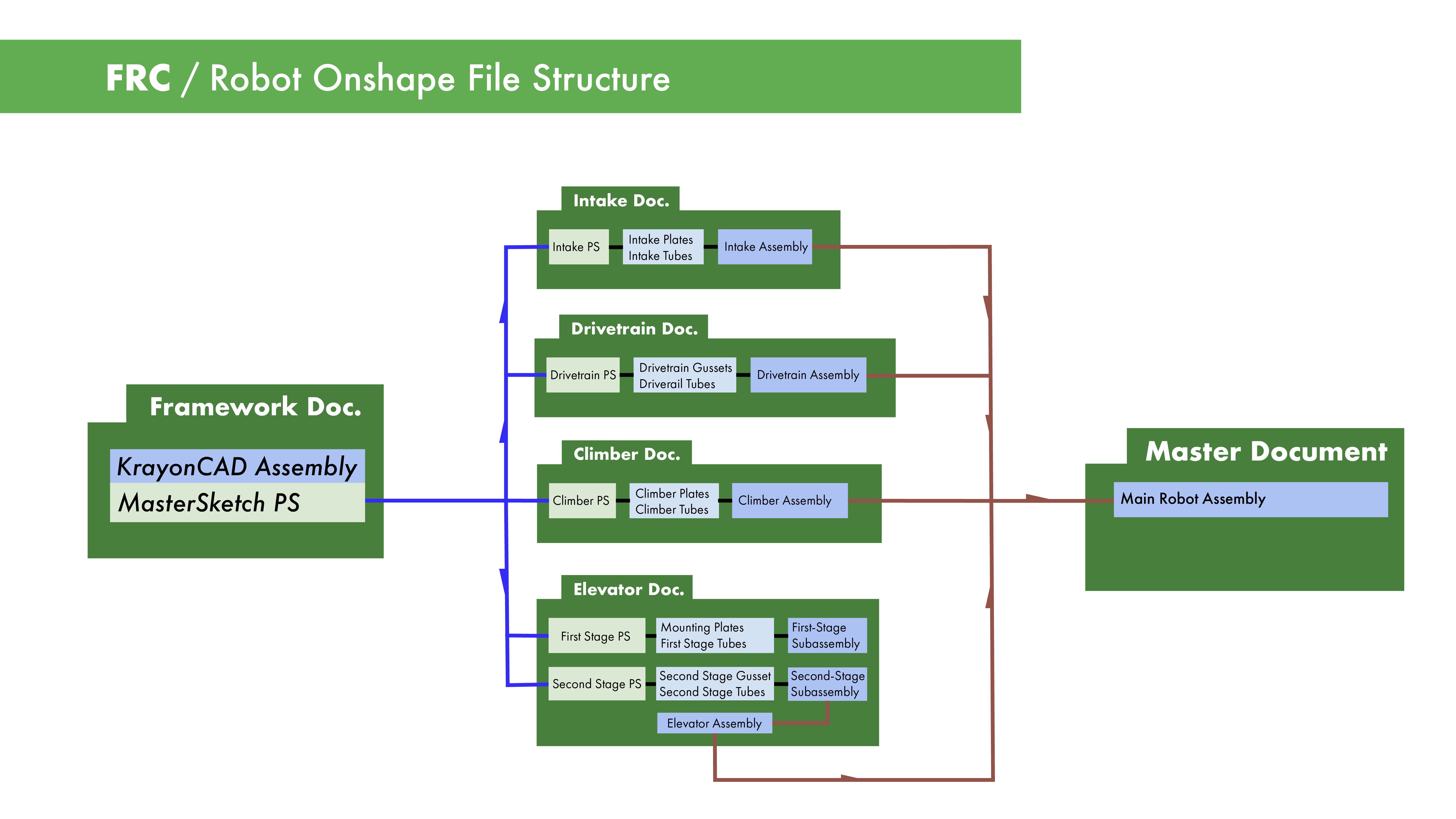 Genel olarak, bir FRC robotu tek bir belge içinde tamamen oluşturulmak için çok karmaşıktır ve çok fazla parçaya sahiptir. Bunu yapmak mümkündür, ancak kötü yükleme sürelerine ve muhtemelen zayıf organizasyona neden olacaktır.