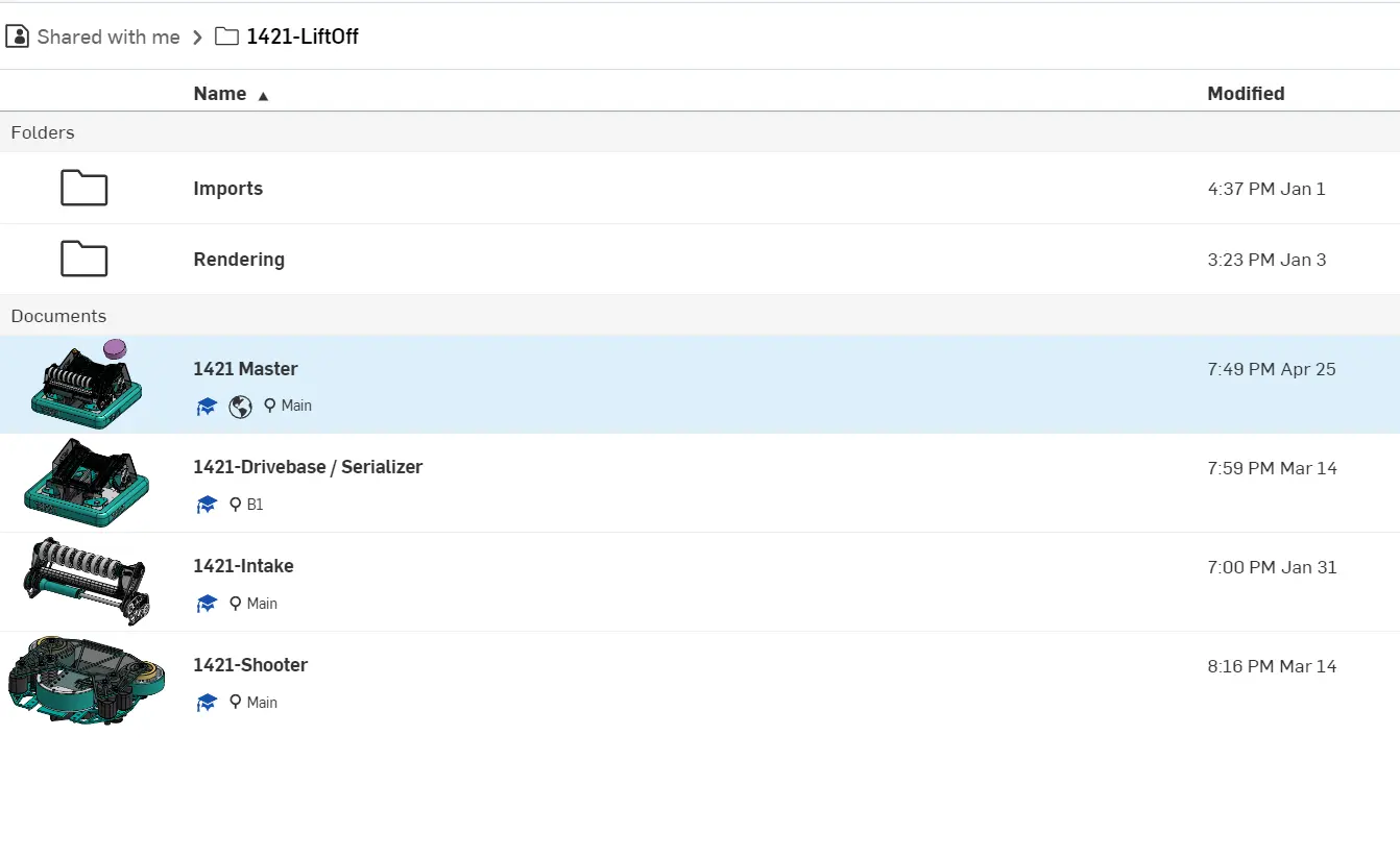 - Her alt sistem için part studio'ları, alt assembly'leri ve üst düzey assembly'yi içeren birkaç "Alt Sistem" belgesi, örneğin bir Intake.