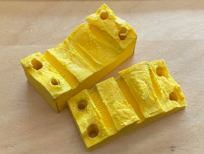 3D yazıcı, yaygın işlemler için hassas kalıplar ve fikstürler yapmak için de kullanılabilir. Aşağıdaki örnekte, kalıp, bir profil plakası için delikleri tam olarak profilin ucundan 0.5" olacak şekilde yapmak için kullanılır.