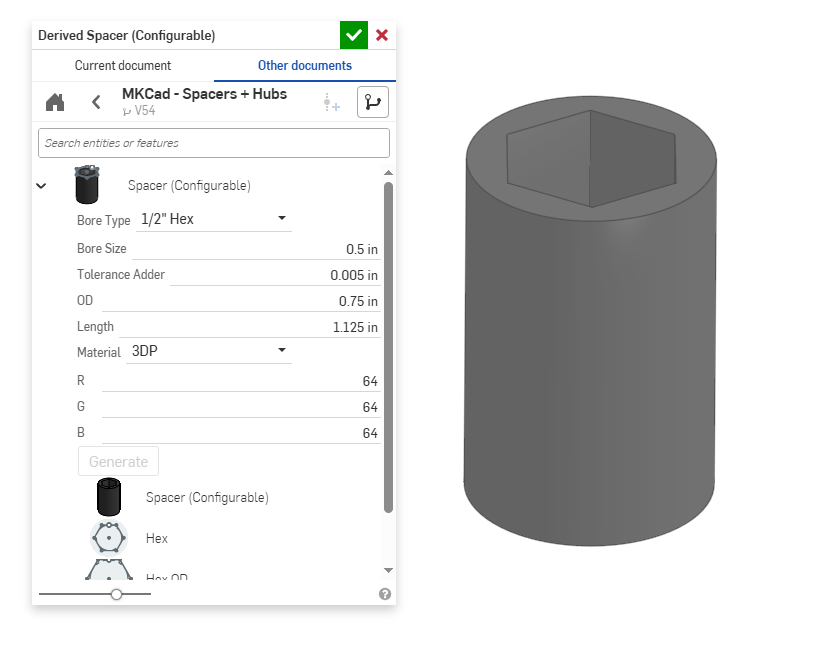FRC'de 3D yazıcı için en basit kullanım durumlarından biri, hex milleri için özel aralıklar yapmaktır. MKCAD kullanarak farklı türde aralıklar hızla yapabilir ve uzunluğu özelleştirebilirsiniz. Bunlar çok düşük maliyetle çok kolay yazdırılır. İletişim kutusunda ek tolerans (Tolerance Adder) seçeneği görebilirsiniz. 3D yazıcılar genellikle çok hassas parçalar üretebilir, ancak termal genleşme, filament tutarsızlıkları, zayıf kalibrasyon ve diğer hata kaynakları gibi faktörler parçanın boyutlarının amaçlandan daha büyük veya daha küçük olmasına neden olabilir. Bunu ele almak için, parçaların iyi bir şekilde oturması için tolerans (iki parça arasındaki boşluk) ekleyebiliriz. Muhtemelen belirli yazıcınızın elde edebildiği en iyi toleransı bulmanız gerekecektir, ancak makul bir başlangıç toleransı genellikle yaklaşık 0.004"-0.020" (0.1mm-0.5mm) olacaktır, istenen oturum türüne (müdahale, yakın, boşluk) bağlı olarak. Birçok çevrimiçi 3D baskı sitesi, belirli bir yazıcı/filament kombinasyonu için minimum toleransı bulmak için test baskıları sunar.