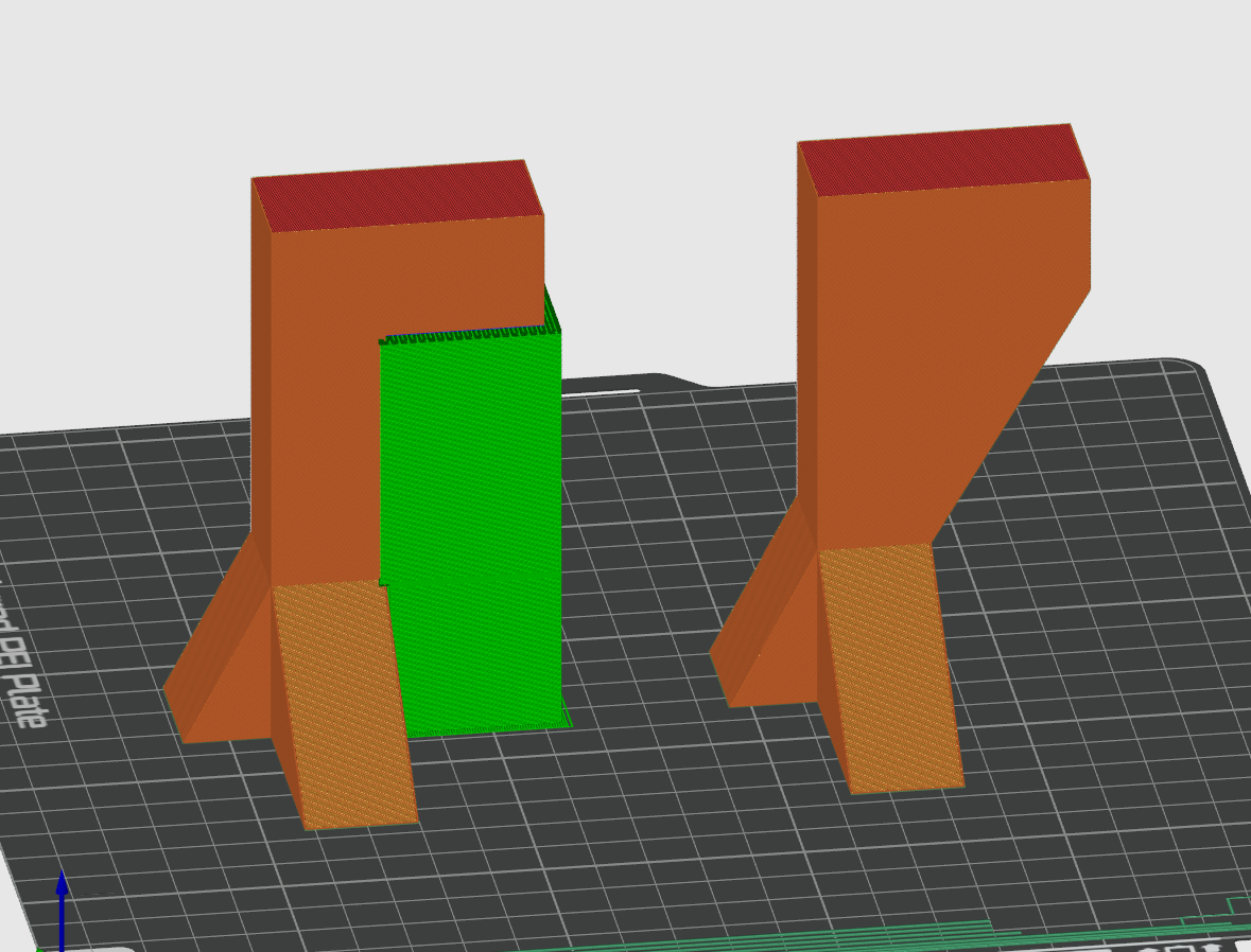 Destek malzemesi (yeşil) ile tutulan bir taşması olan soldaki parça, sağda ekstra geometri eklenen parçaya göre %23 daha fazla filament kullanır. Ek olarak, sağdaki parça daha güçlü olacaktır, çünkü taşan özellik daha iyi desteklenmektedir.
