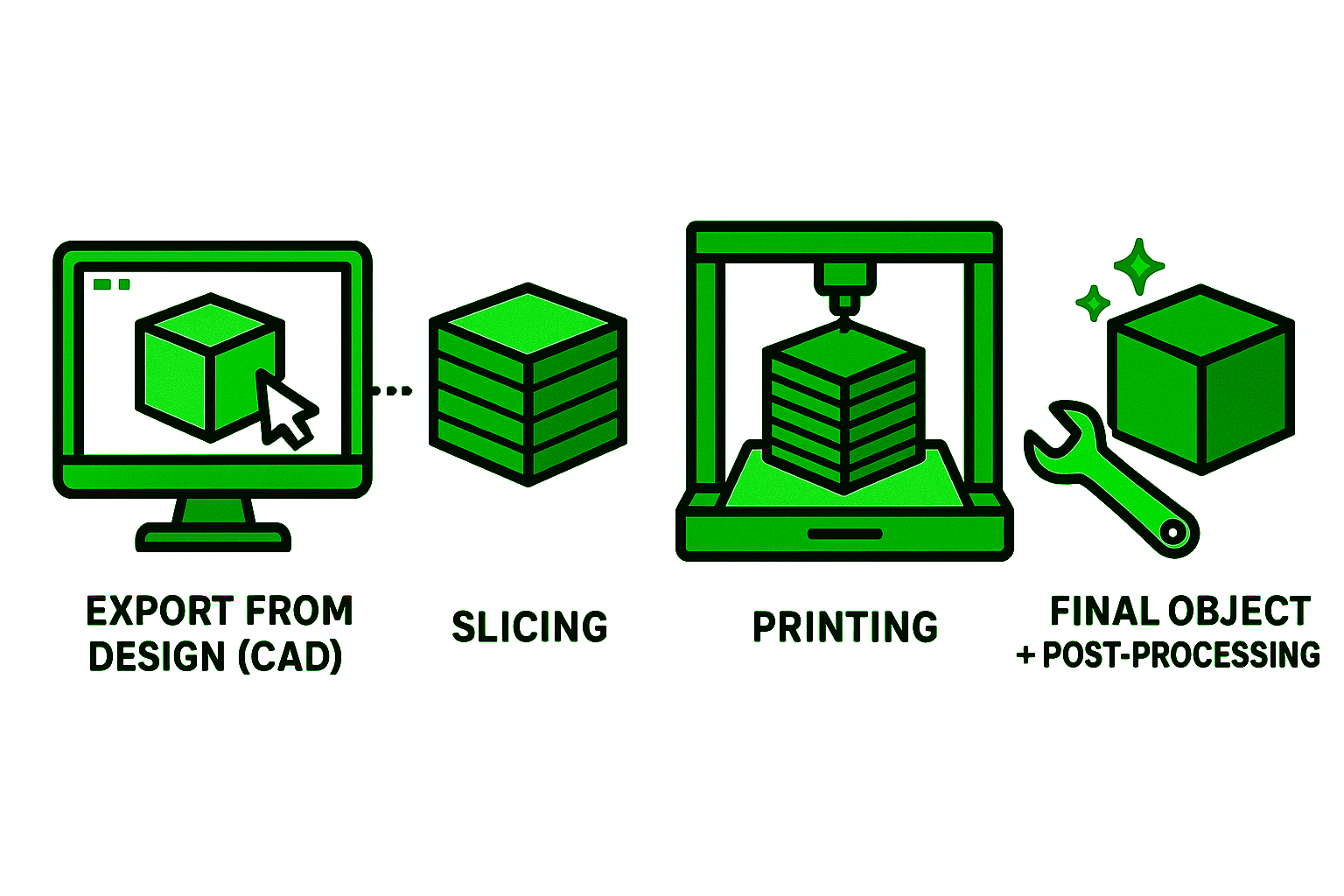 - Yazdırma G-code 3D yazıcıya yüklenir ve malzemeyi katman katman hassas bir şekilde biriktir, nesneyi aşağıdan yukarıya doğru tamamlanana kadar inşa eder.