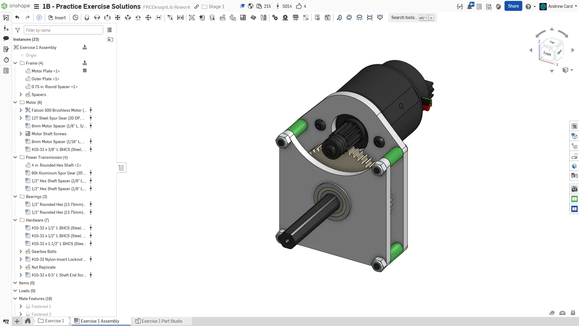Bu egzersizde, basit bir tek kademeli şanzıman modelleyip monte edeceksiniz. Bu egzersizin amacı, çok basit bir dişli aktarımının nasıl modelleneceğini tanıtmaktır. Ayrıca, [Robot Shaft ve Robot Spacer Featurescripts](https://cad.onshape.com/documents/9cffa92db8b62219498f89af/v/0d2ae9a0b843b03bdb63724f/e/99672d1e329b38e647d90146 "Alex's Featurescripts Onshape Document"){:target="_blank"} veReplicate` aracının nasıl kullanılacağını öğreneceksiniz. Ayrıca, dişliler ve motorlar gibi fastener dışındaki bileşenler için FRCDesignLib parça kütüphanesini kullanacaksınız.