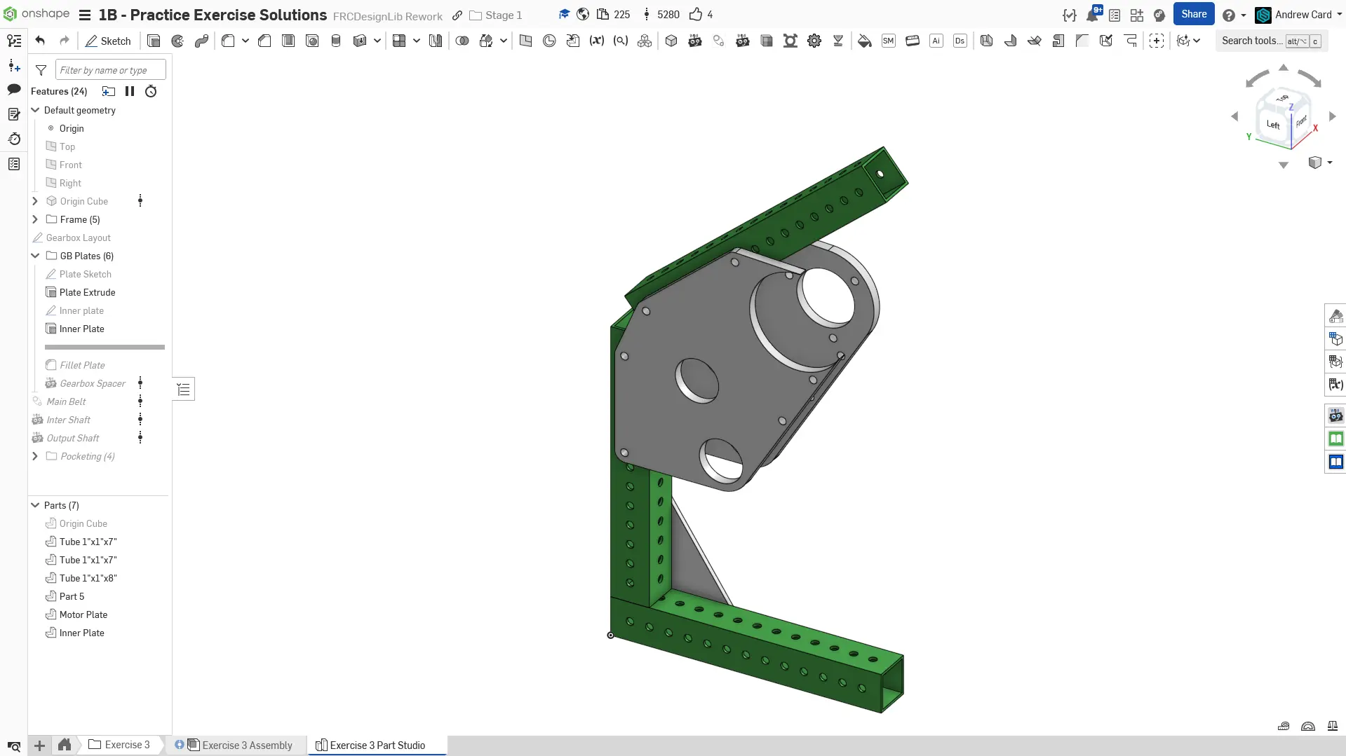 Bu egzersizte, bazı çerçeve elemanlarıyla entegre edilmiş oldukça karmaşık bir şanzıman modellediniz. Bu noktada, sketch ve extrude araçlarına rahat olmaya başlamalısınız. Ayrıca, farklı ayarlarla oynayarak şu ana kadar kullandığınız Featurescript'lerdeki tüm seçeneklere aşina olmalısınız.
