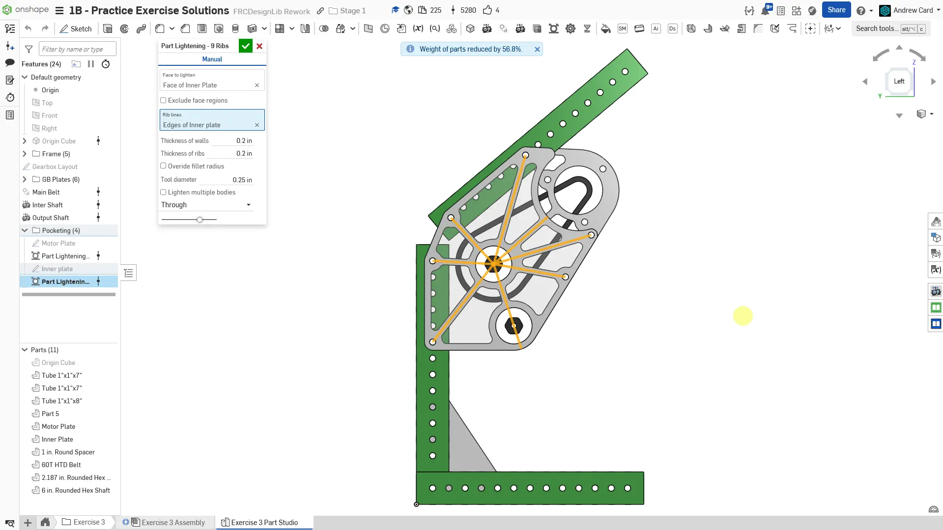 26. Önceki sketch'i seçerek pocket eklemek için Part Lighten Featurescript'ini kullanın. 0.15" genişliğinde kaburgalar ve 0.26" takım çapı kullanın.