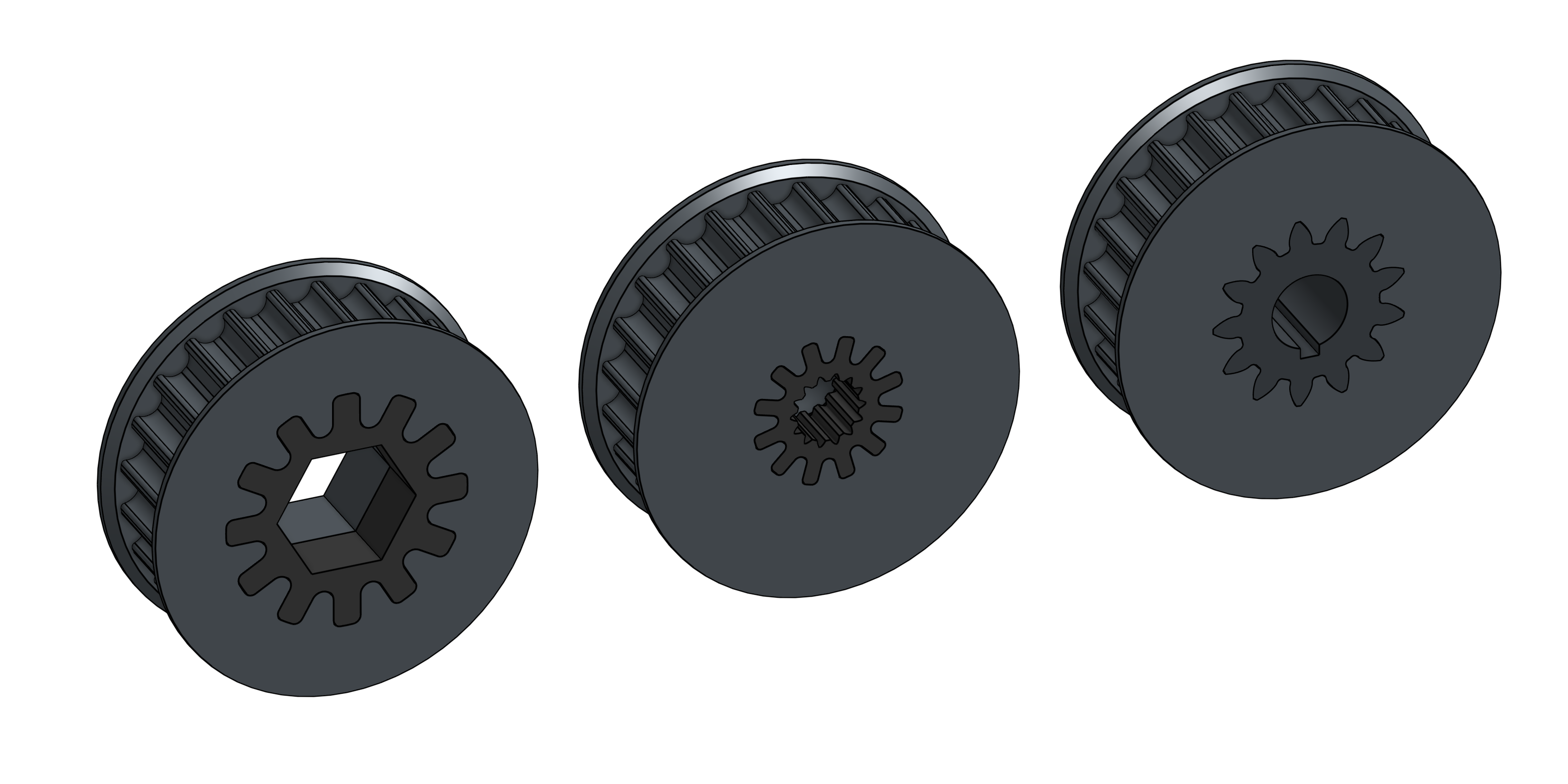 3D-baskı kasnaklar, FRCDesignLib ve Robot Pulley Featurescript'te bulunanlar gibi kasnak üreticileri kullanılarak kolayca oluşturulabilir. Ancak, shaft arayüzüne yakın dikkat edilmelidir. 3D-baskı hex profilleri kolayca sıyırabilir, bu nedenle torku daha iyi transfer etmek için metal bir insert (WCP veya Thrifty Bot gibi satıcılardan) kullanılmalıdır. Aşağıda farklı tipte insert'li 3D-baskı kasnak örneklerine bakın.