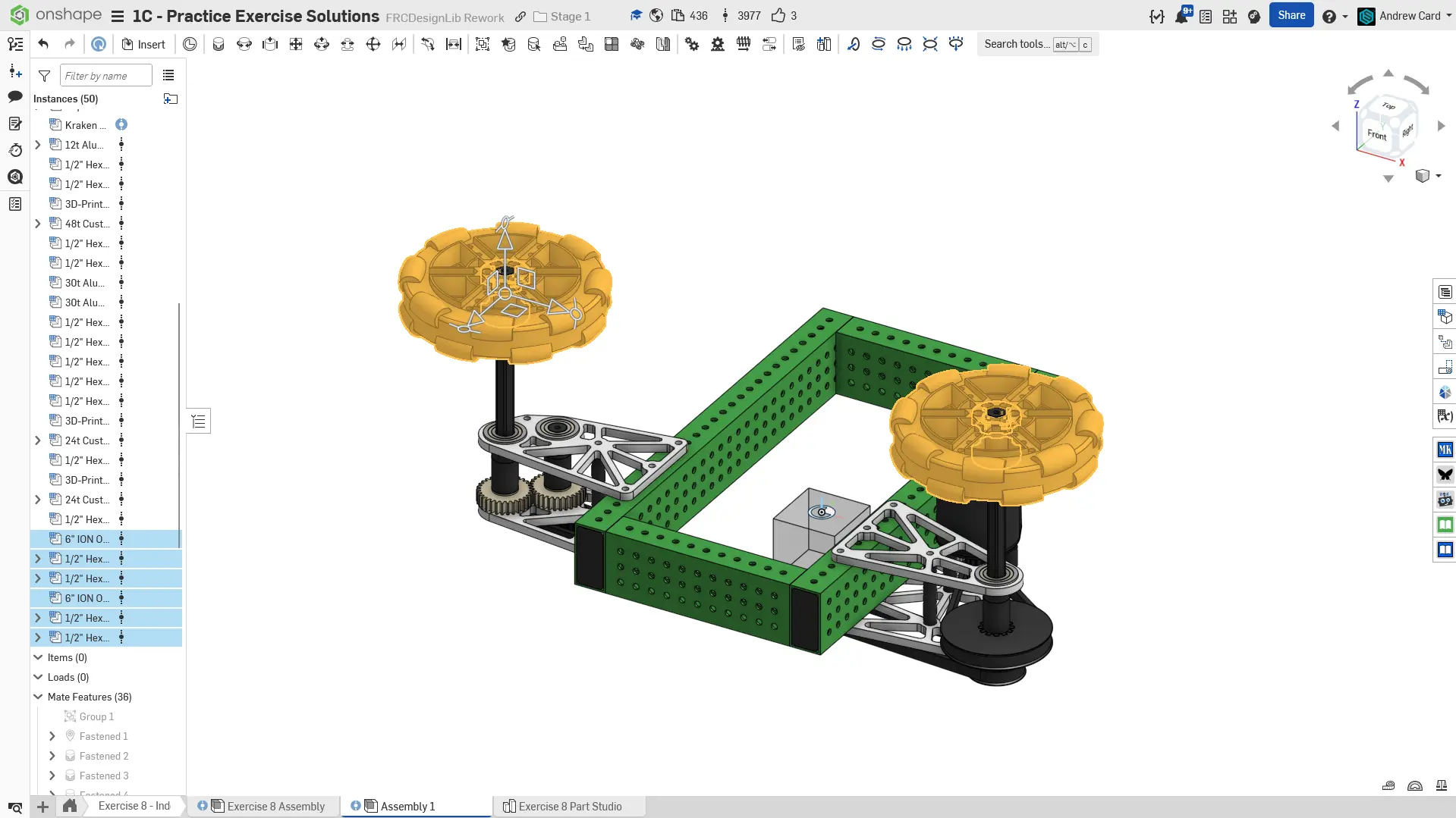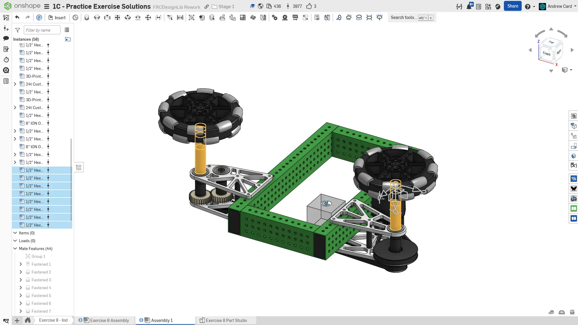 6. FRCDesignLib'den 6" REV Omni-wheel'lerini ve 1/2" Hex MAXHub'ları insert edin ve fasten edin. Hub'ları wheel'lere fasten edin ve wheel assembly'lerini uzun shaft uçlarına fasten edin.