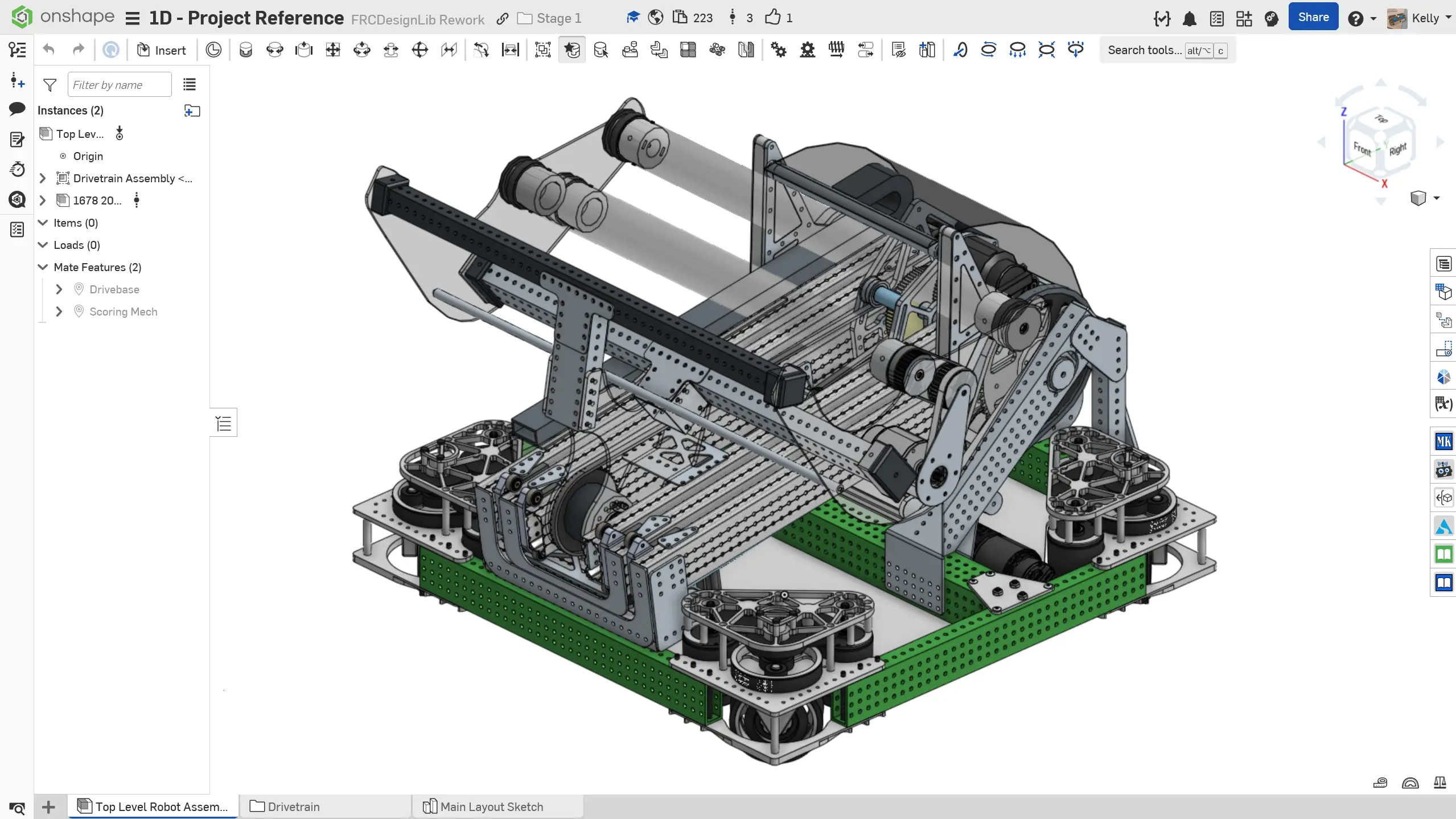 Başlamak için, Main Layout Sketch part studio'nun üzerinde yeni bir montaj sekmesi oluşturun ve adını Top Level Robot Assembly koyun. Üst düzey robot montajını tamamlamak için slaytlardaki talimatları izleyin.