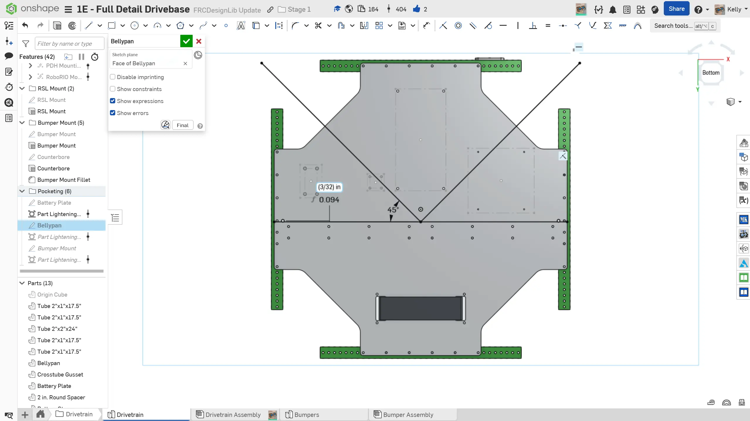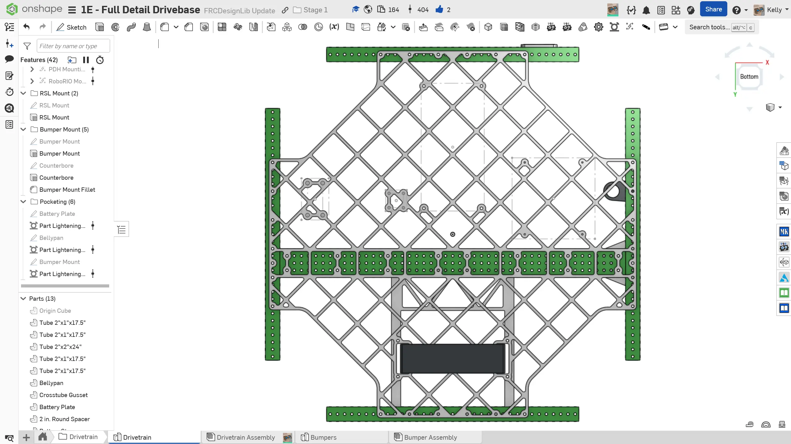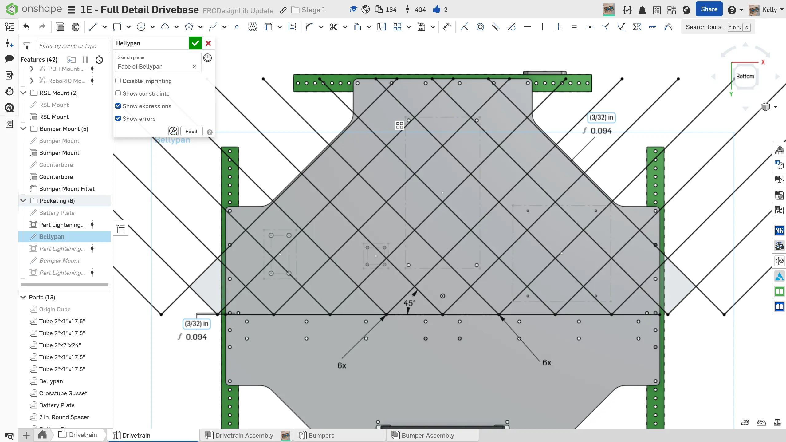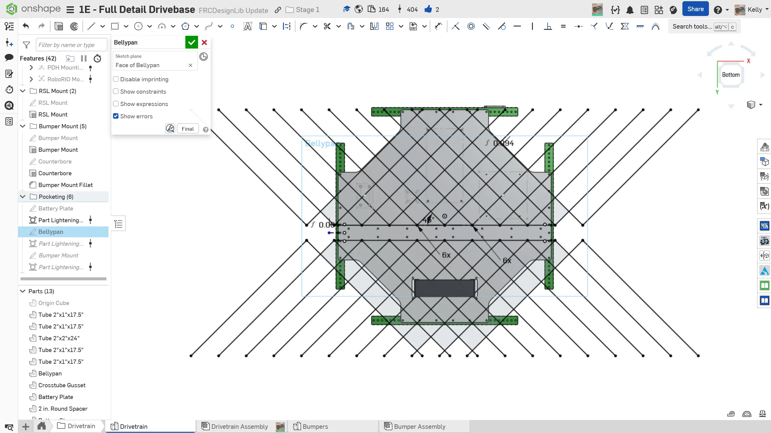 Eğer drivetrain'iniz için bellypan'ınızı pocketlemeyi seçerseniz, Part Lighten Featurescript kullanan slaytlardaki talimatları takip edebilirsiniz. Bellypan'ı pocketlemek için Vent veya Part Lighten Featurescripts'lerini de kullanabilirsiniz. Her Featurescript arasında iş akışı biraz farklı olsa da, genel fikir aynıdır. Güç ve kolay modelleme için elmas deseni önerilir.