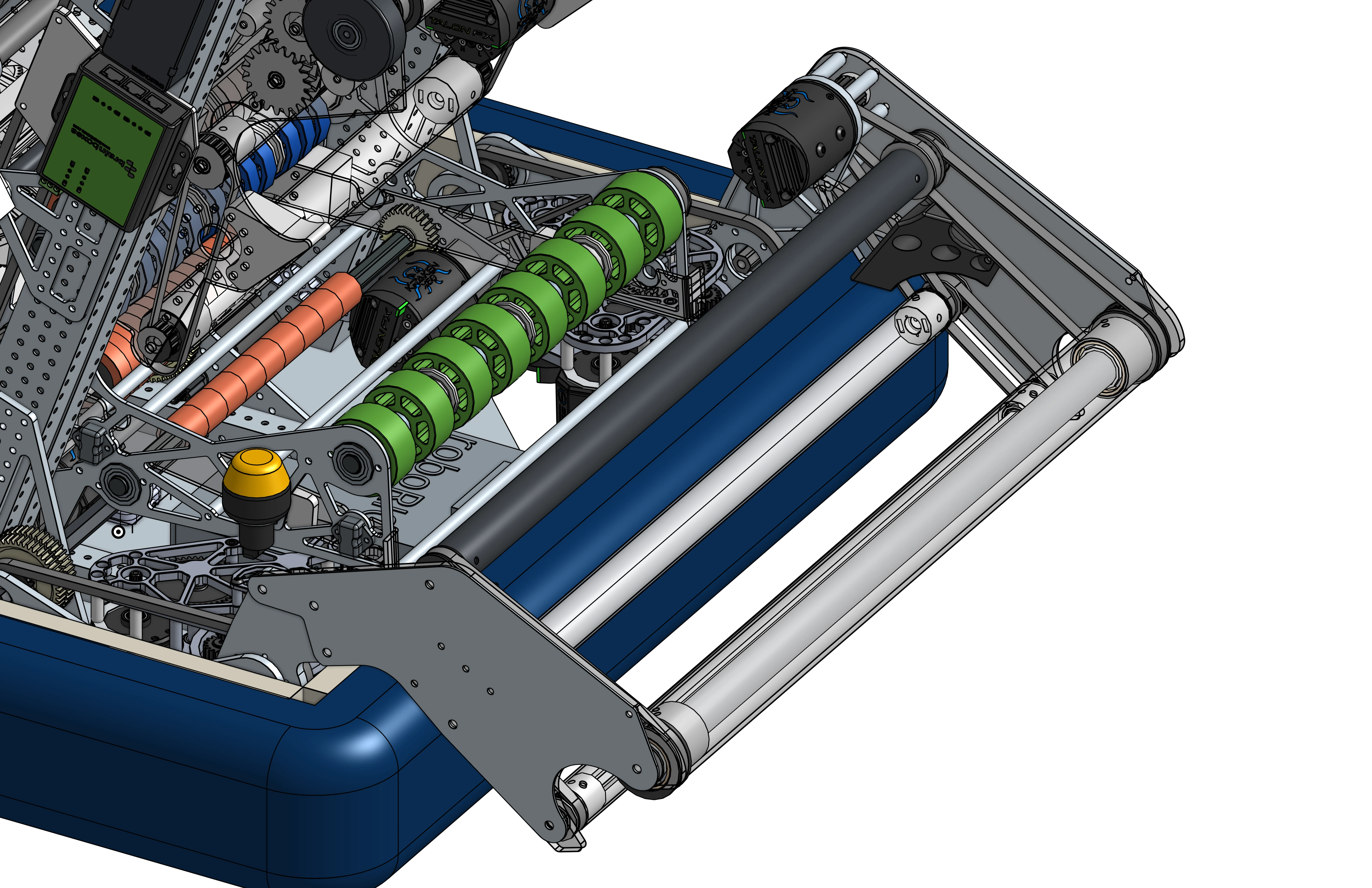 Infinite Recharge toplarını merkezlemek için vektörlü tekerlekleri olan pnömatik aktüatörlü toplayıcı